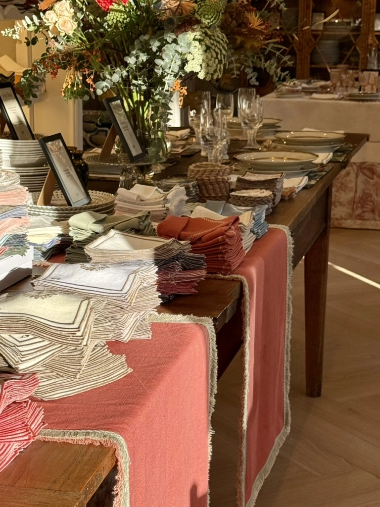 La personalización es clave: los manteles de lino de doble ancho permiten cubrir grandes mesas, las servilletas pueden bordarse con iniciales o motivos únicos, y los individuales reversibles ofrecen dos estilos en una sola pieza. Los precios varían según el tejido y tamaño: los manteles parten de los 300 €, los individuales entre 65 € y 80 €, y las servilletas entre 35 € y 67 €.