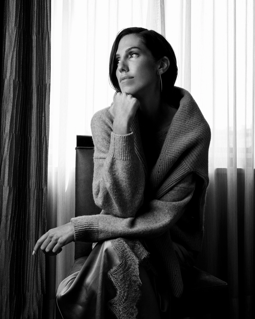 Carla lleva jersey de pico en hilo italiano, falda cruzada de satén con detalle de encaje y prenda superpuesta, todo de HUGO BOSS; y joyas de MARINA GARCÍA