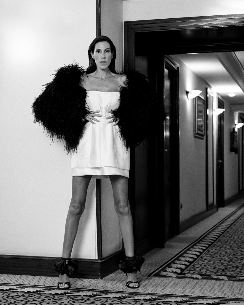 En la imagen de portada, Carla Hinojosa posa con Vestido de tul con plumas de ALICIA RUEDA ATELIER; sandalias de ROGER VIVIER; y pendientes de MARINA GARCÍA. Sobre estas líneas, vestido de lana y tafetán de BARO LUCAS, sandalias negras de JIMMY CHOO; y pendientes de oro esmaltado con flores y frutas de ROGER VIVIER.