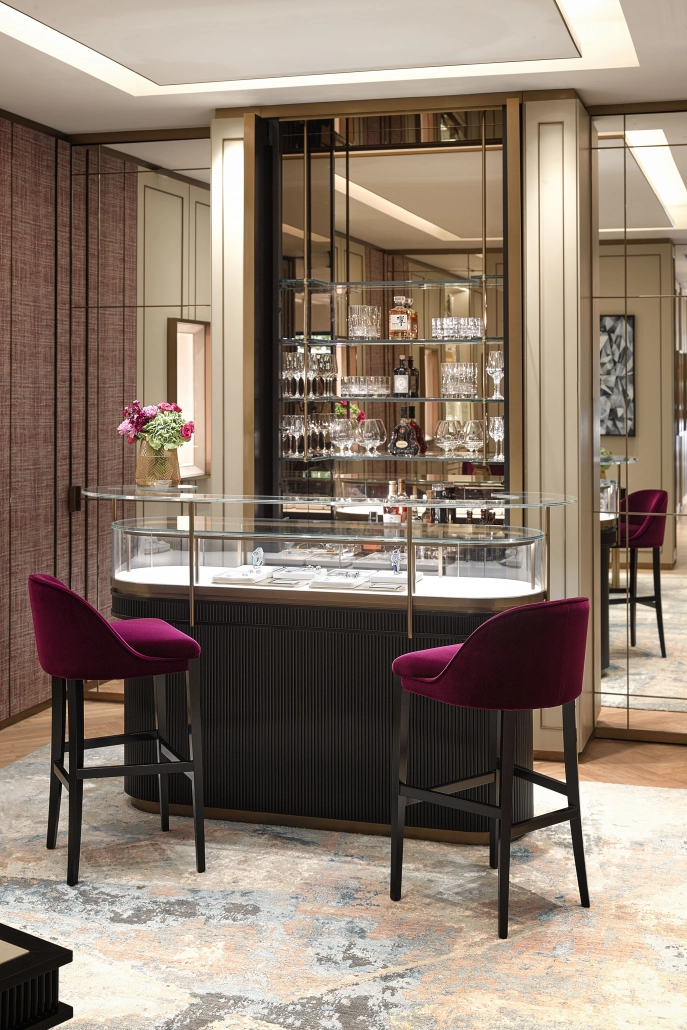 En la planta inferior, el Gentlemen’s Club ofrece un espacio privado para coleccionistas y conocedores, mientras que el salón de Alta Joyería rinde tributo a Caroline Scheufele con tonos amatista y una obra inspirada en un diamante talla cojín creada junto al estudio milanés Fabscarte. Cada detalle arquitectónico, desde los espejos hasta los materiales nobles, evoca la precisión y la belleza de una joya.
