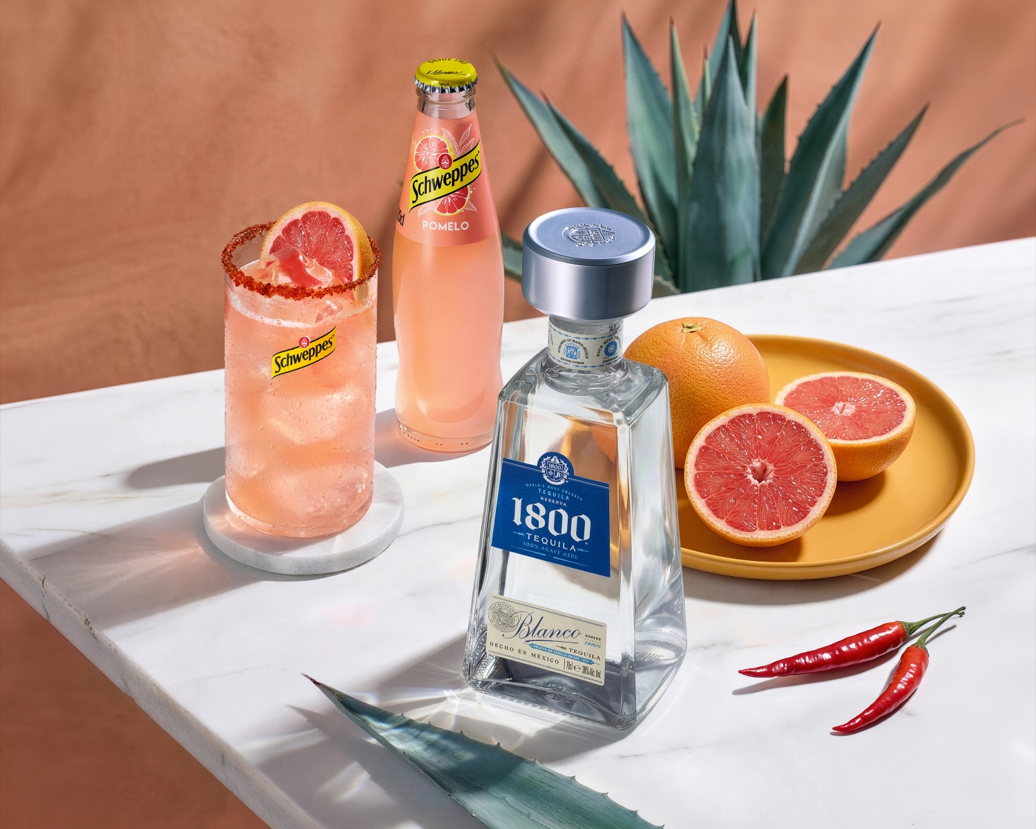 El primer paso es preparar el vaso: se humedece el borde con zumo de lima y se escarcha con una mezcla de sal y tajín, aportando un contraste entre lo salino y lo cítrico. A continuación, se llena el vaso con hielo y se añade el tequila junto con el zumo de limón. Se completa con Schweppes Pomelo, que aporta la burbuja y el carácter refrescante, y se mezcla suavemente para integrar los sabores. Como toque final, se decora con una rodaja de pomelo fresco, reforzando el perfil aromático del combinado.
