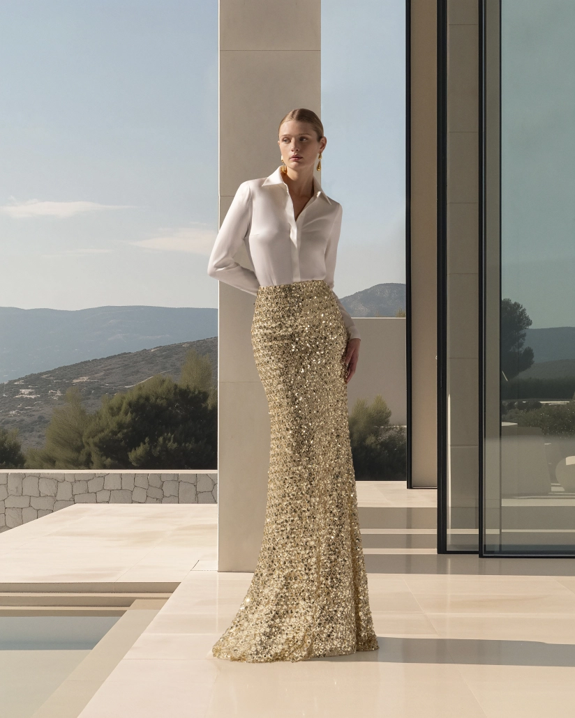 La colección también apuesta por la versatilidad de los conjuntos dos piezas y los vestidos joya. Un nuevo tejido de pedrería geométrica en rombos dorados se aplica a diseños midi de líneas depuradas y escote cerrado, y a conjuntos de camisa satinada blanca con falda de pedrería, reforzando el estilo único, elegante y atemporal de Paloma Cuevas x Rosa Clará.