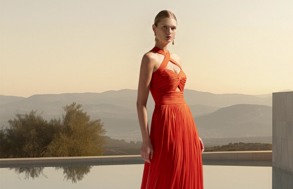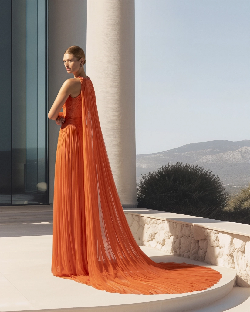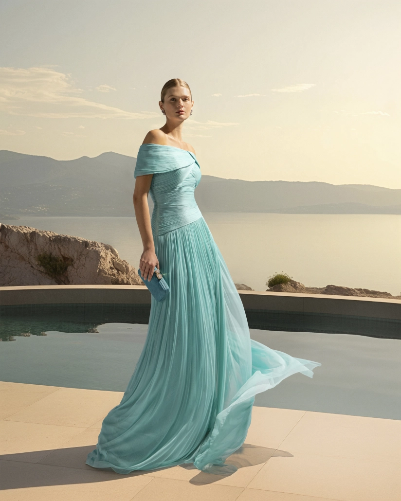 La delicada muselina de seda, favorita de Paloma Cuevas, se presenta en vestidos plisados con drapeados que realzan la silueta. Escotes halter, palabra de honor y asimétricos se combinan con colores vibrantes como coral, turquesa y cian, decorados con sutiles pedrerías, para crear looks modernos y con carácter.