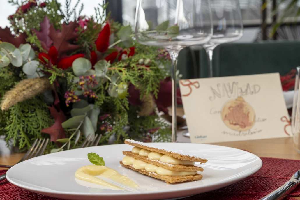 El dulce final llega con unas milhojas de hojaldre caramelizado, rellenas de crema de vainilla y con un delicado toque de hojas de azahar, todo ello acompañado de un maridaje de lujo, como merece la última noche del año, y, cómo no podía ser de otra manera, champagne para alzar las copas y dar la bienvenida al 2026.