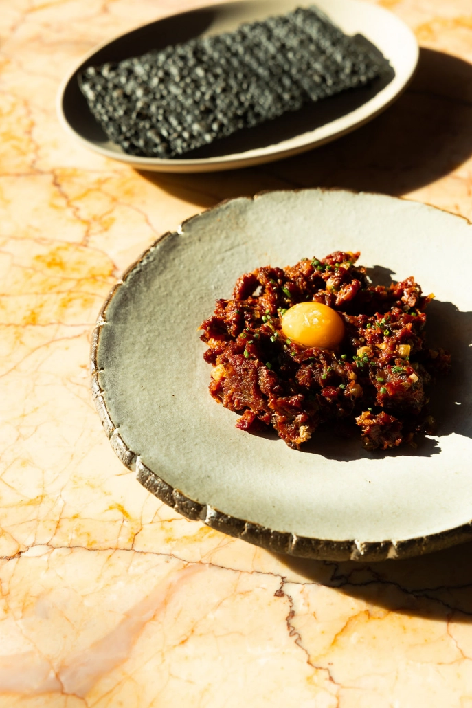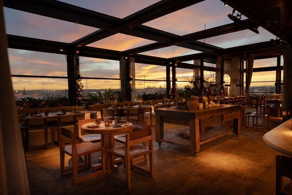 El restaurante se despliega en el rooftop del establecimiento hotelero como un espacio concebido al milímetro, donde cada rincón responde a un momento distinto del día. El acceso, desde la propia plaza, anticipa la experiencia. Un ascensor conduce hasta el escenario de la velada. La primera parada dominada por su Reposado Bar, perfecto para un cóctel bajo el cielo capitalino. Al atravesarlo, sobre un delicado vacío de luces que evoca una aquelarre de luciérnagas, se revela el corazón del proyecto: el comedor, articulado en torno a una barra cuadrada rodeada de asientos, con una paleta de tonos tierra. A su alrededor, las mesas se insinúan entre frondosas plantas y arbustos, componiendo pequeños refugios que invitan a la charla y el disfrute. Y como telón de fondo, unas vistas inmejorables que se despliegan a través de amplias cristaleras, convirtiendo a la ciudad en parte esencial del relato.