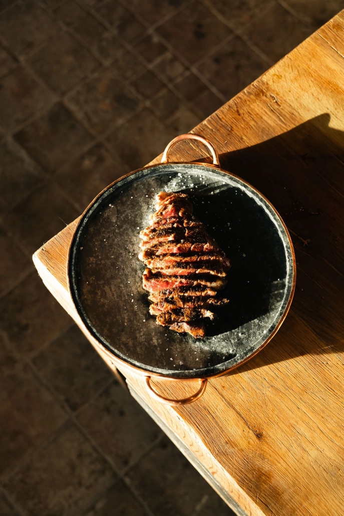 La carta es amplia y pensada para que cualquiera encuentre su sitio, pero con un hilo conductor evidente: el fuego. Aparece ya desde el inicio, en platos como el tartar de tomate ahumado, una versión vegetal muy bien resuelta y que nada tiene que envidiar al tartar de carne más clásico, con el que convive. A partir de ahí, el recorrido se mueve entre verduras, pescados y carnes, siempre con la brasa como nexo. En los entrantes, la huerta tiene peso, con propuestas como la coliflor a la brasa o los puerros con salsa romesco. De la lonja llegan pescados como la lubina o el lenguado, trabajados con precisión para mantener su carácter, mientras que en las carnes destacan el pollo a la brasa, la pluma ibérica o el lomo bajo, bien afinados y coherentes con el planteamiento general.