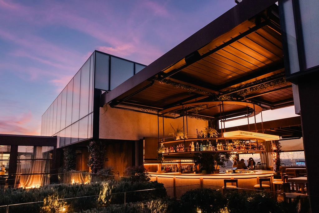 El universo visual de Makáá lleva la firma de Patricia Bustos, cuya intervención traduce el concepto de fuego desde la calma. Volúmenes suaves, texturas vivas y guiños a la arquitectura brutalista de los años setenta conviven con una estética mediterránea que dialoga con la azotea. Bustos construye un escenario táctil y sereno, donde cada detalle —desde los óculos que enmarcan el skyline hasta las superficies envejecidas que respiran el paso del tiempo— convierte el espacio en una experiencia sensorial.