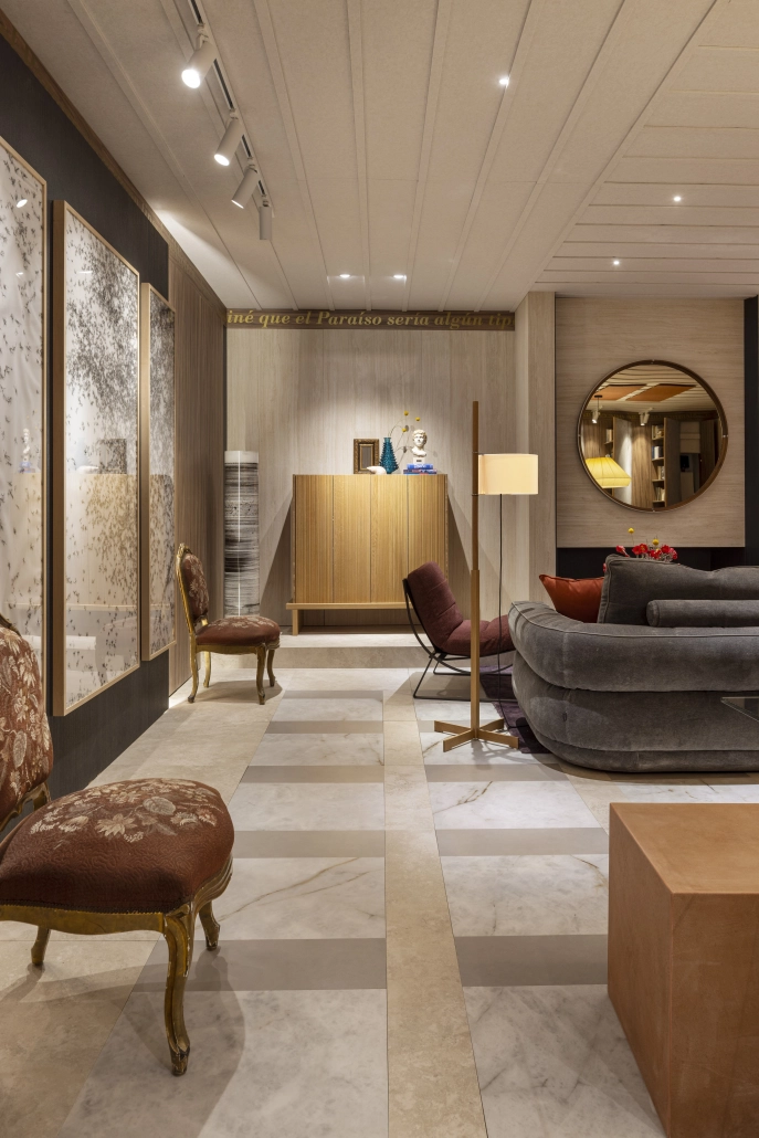 En “Entre superficies y palabras”, el estudio compone una atmósfera rica en contrastes sutiles y referencias culturales, donde los materiales adquieren un papel protagonista. Las superficies de Neolith se integran en la arquitectura del espacio y en diferentes soluciones decorativas con una presencia elegante y serena, reforzando el carácter envolvente del conjunto.