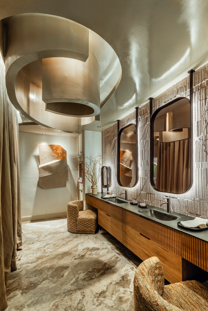 El espacio se articula en dos ámbitos —zona vanity y baño experiencial— conectados por un recorrido orgánico que guía al visitante de forma natural. Sobre ellos, un sistema de cúpulas dinámicas introduce una dimensión escenográfica que genera una sensación de arquitectura viva, en constante expansión y contracción, intensificando la experiencia inmersiva.