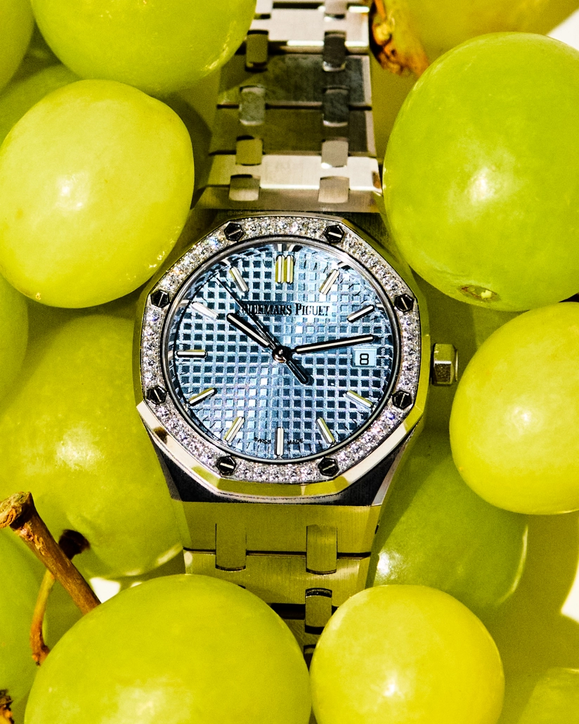Reloj Royal Oak en acero con bisel engastado con 40 diamantes y esfera azul con motivo Grande Tapisserie (31.200 €), de AUDEMARS PIGUET.